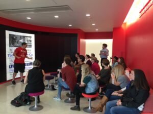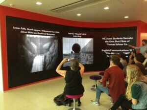 The Edison assignment grew out of a spring 2014 foray I made into combining conventional scholarly research with media-making that was designed to take advantage of the high-tech exhibition spaces in our campus’s state-of-the-art Hunt Library. “Shooting Wars”, designed for MA-level students in a course on War Documentaries, asked students to utilize archival footage to create a three-screen installation (with sound) documenting an American conflict, which was then exhibited in the Library’s Game Lab. Extensive documentation of this project, including interviews with students, is available as an NCSU Library Story.