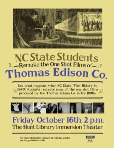 Jason Paul Evans Groth, our amazing library liaison, will pair your new videos with the Edison originals for our split screen exhibition. These paired movies will be shown in the IPearl Immersion Theater, one of Hunt Library’s giant public video displays.