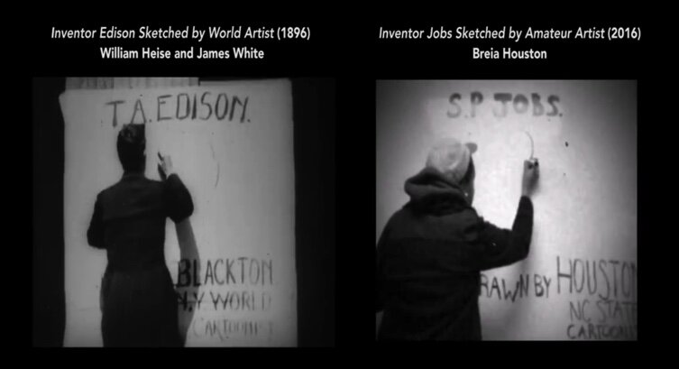 A project revolving around a one-shot Edison Co. film seemed like a good starting point for a larger class at the undergraduate level. Students pick one Edison Co. film from a list of options that are digitized and available for them to watch repeatedly, then closely study its framing, the movement within the frame, and its mise-en-scène. Students then recreate the film in whatever fashion and context they deem appropriate and engaging, using either their smartphone cameras or higher-quality cameras borrowed from the library. Key to the assignment is that I ask students not to feel compelled to travel back in time to make the film as if it were the 1890s, but rather to remake the film in the context of the present day. For example, if blacksmithing seems outmoded, what seems like a contemporary mode of work? It can either be a fairly precise remake or it can deviate from the original and provide commentary on the differences between then and now. For example, every semester at least one student has filmed a lightning sketch of Steve Jobs instead of Thomas Edison, opting to depict the person in their generation whom they consider to be the most impactful inventor of the day.